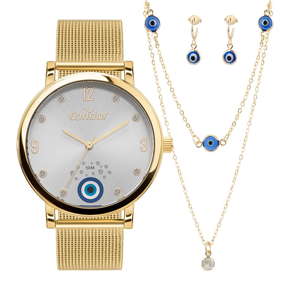 Um presente que conquista pelo olhar. Relógios delicados com acessórios encantadores. Em kit pensado com carinho, o mostrador ganha brilho e detalhe de olho grego com pulseira em banho dourado. Ideal para celebrar o afeto em forma de presente.