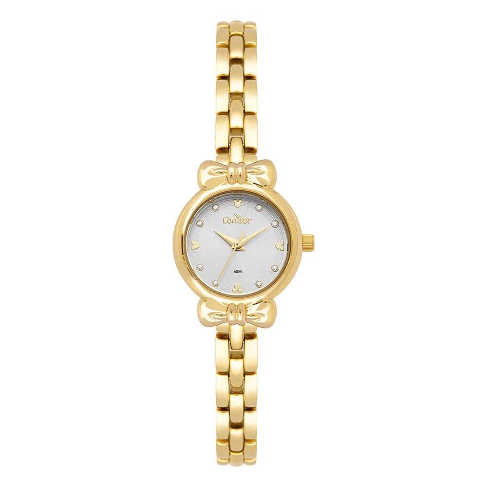 Modelo com banho dourado, caixa com alça em formato de laço, detalhe de brilhos e silhueta do Mickey no mostrador.