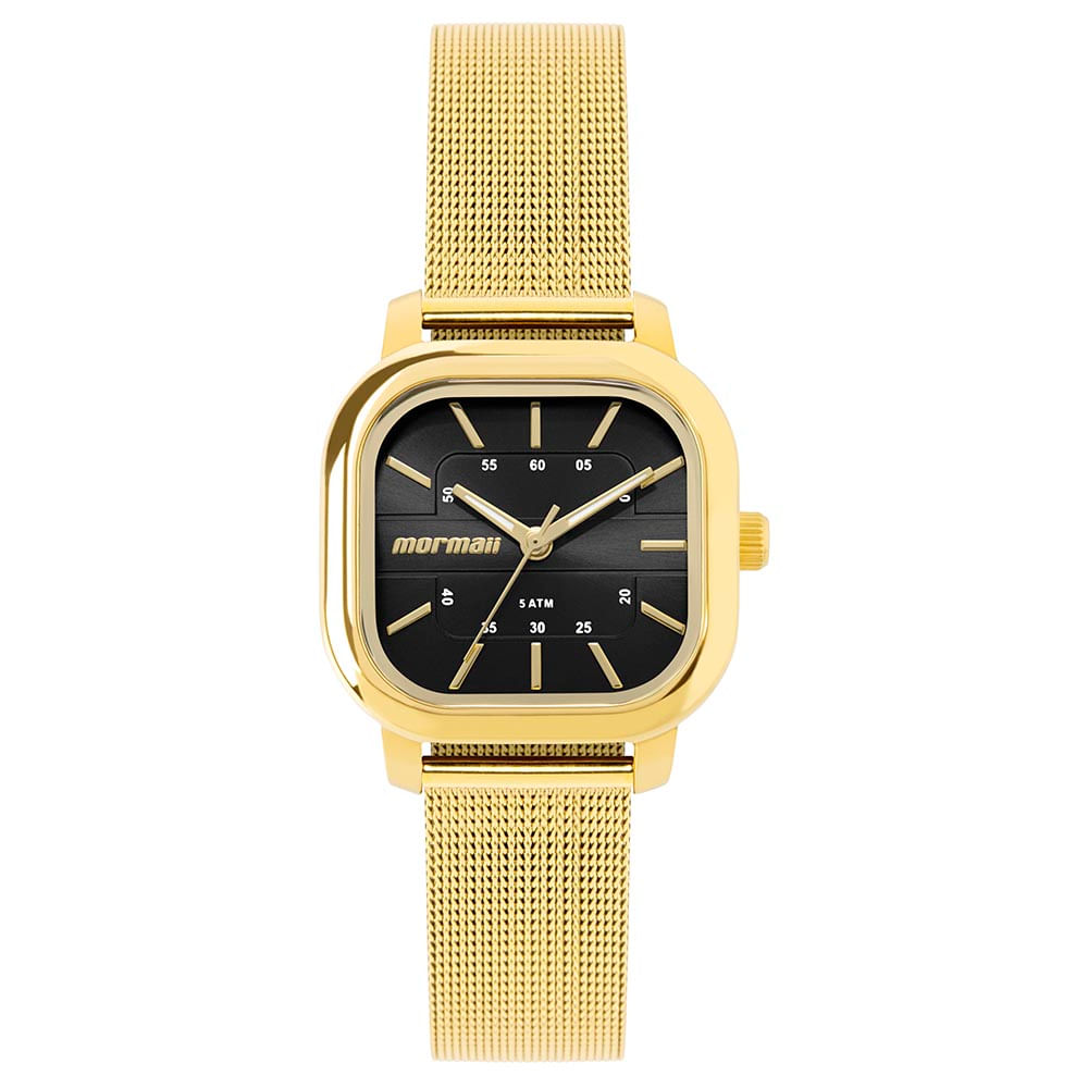 A linha Neo Vintage apresenta o novo modelo analógico da Mormaii, com design estiloso e pegada urbana. Com caixa em aço inoxidável no formato quadrado, pulseira de aço inoxidável em mesh banhada em dourado e mostrador na cor preta com textura em relevo, o modelo une estilo e praticidade no dia a dia. Além disso, o relógio conta com ponteiros largos, pulseira de ajuste fácil e resistência à água de até 50 metros.