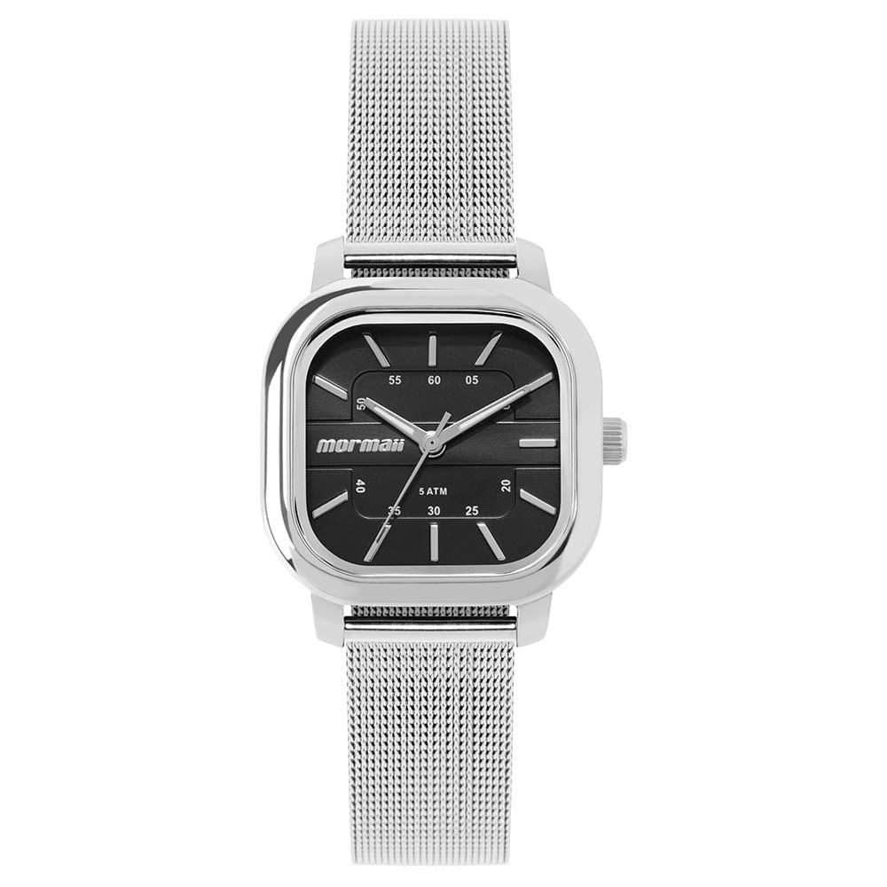 A linha Neo Vintage traz modelo com design diferenciado, pela caixa quadrada de tamanho pequeno e minimalista que valoriza o estilo delicado no pulso. Com caixa em aço inoxidável e pulseira mesh em aço polido com fecho gancho para ajuste fácil, o mostrador recebe acabamento sunray, ou raios de sol, um acabamento no mostrador que cria um efeito de brilho radiante ao refletir a luz em todas as direções, simulando raios solares, trazendo o diferencial do acessório, além de marcadores em relevo com textura de padrão linear central. Ponteiros polidos com interior branco completam o visual elegante. Além disso, o relógio apresenta banho em prata e resistência à água de 50 metros.