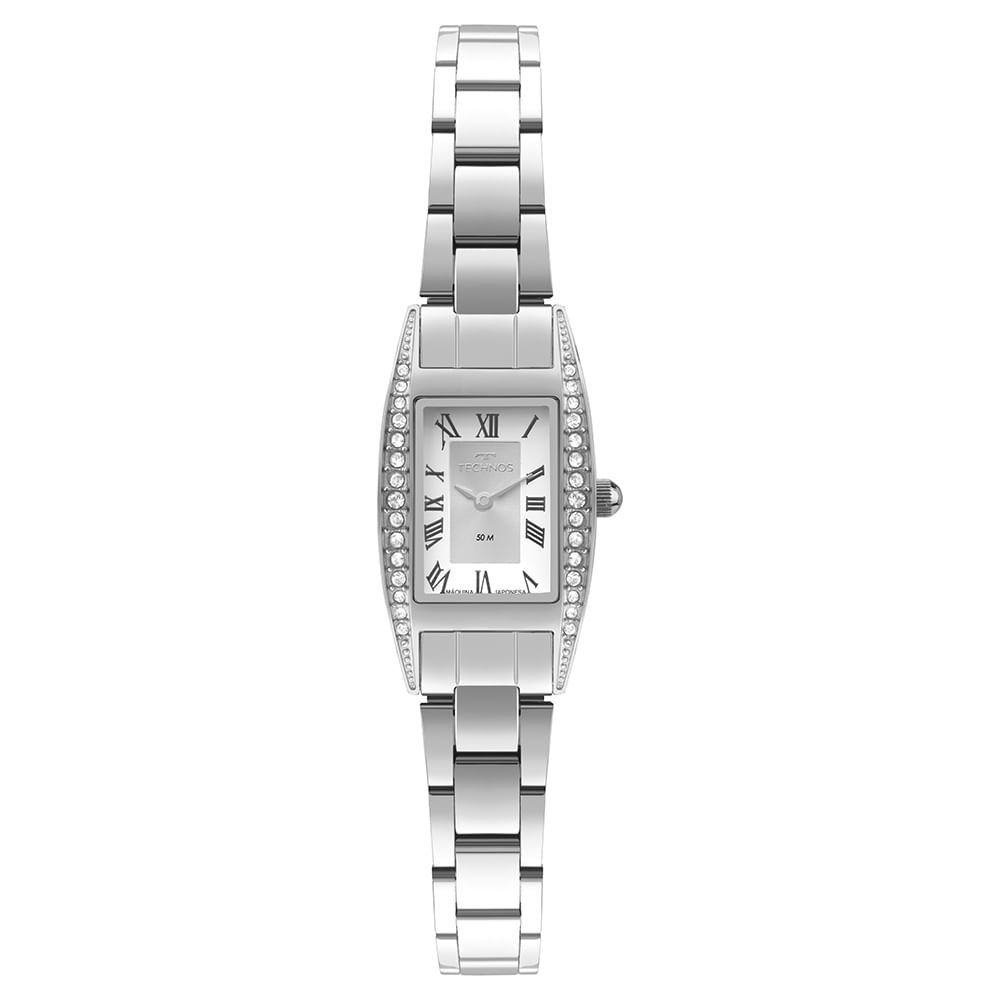 O Technos Boutique é a união perfeita entre design clássico e funcionalidade, trazendo sofisticação em cada detalhe. A linha apresenta modelos com aplicação de pedras delicadas nos marcadores de hora e também versões com mostrador prata texturizado e numeração romana completa, garantindo fácil leitura e um visual refinado. Como destaque especial, a aplicação de pedras nas laterais da caixa adiciona um brilho sutil e elegante, elevando o relógio ao universo das joias e reforçando a exclusividade do acabamento. Disponível no banho prata, com caixa de 19,5mm em aço inoxidável, pulseira de 3 links e resistência à água de até 50 metros.