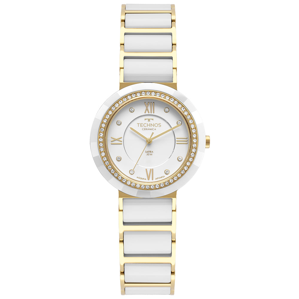 Novo modelo da linha Ceramic, com aplicação de pedras no aro interno. Seu mostrador também apresenta aplicação de pedras nos marcadores de hora, além da elegante numeração romana e assinatura da linha. Seu diferencial está nos materiais utilizados em sua composição: feito em aço inoxidável em banho dourado, ele apresenta aplicação de cerâmica branca na pulseira e no aro externo, além de possuir Vidro de Safira, ambos altamente resistentes a riscos e arranhões. Produto com máquina quartz japonesa Miyota, tamanho de caixa 30mm e resistência à água de 50m.