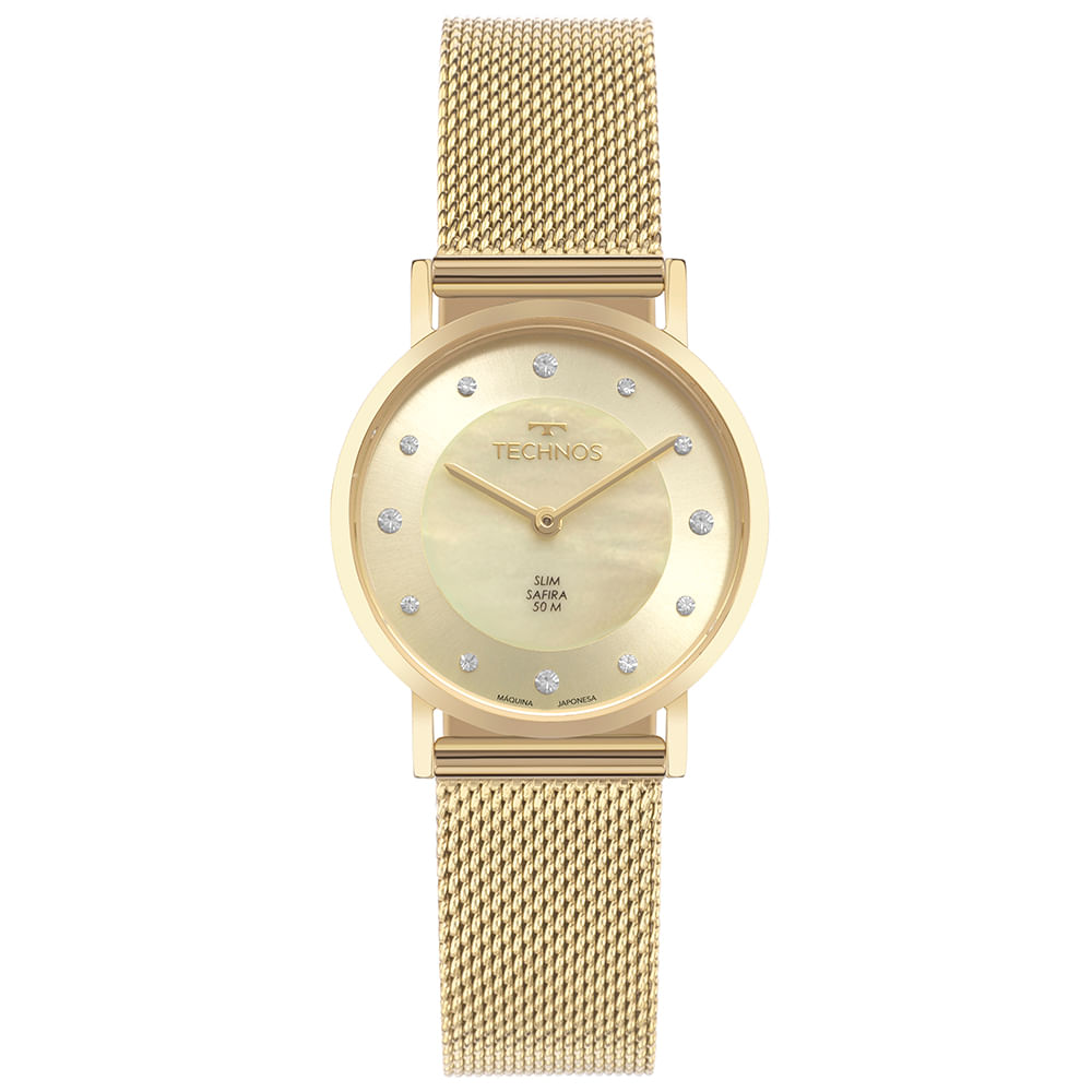 A Linha Slim combina design sofisticado e conforto. Com caixa de espessura ultrafina de 7,10 mm e 35 mm de diâmetro, é produzido em aço inoxidável e conta com pulseira em mesh, garantindo leveza e ajuste perfeito ao pulso. O mostrador prata ou champanhe em madrepérola traz brilho sutil, com marcações de hora aplicadas com pedras e assinatura exclusiva da linha. A lente de safira oferece alta resistência a riscos, além de possuir resistência à água de 50 metros.