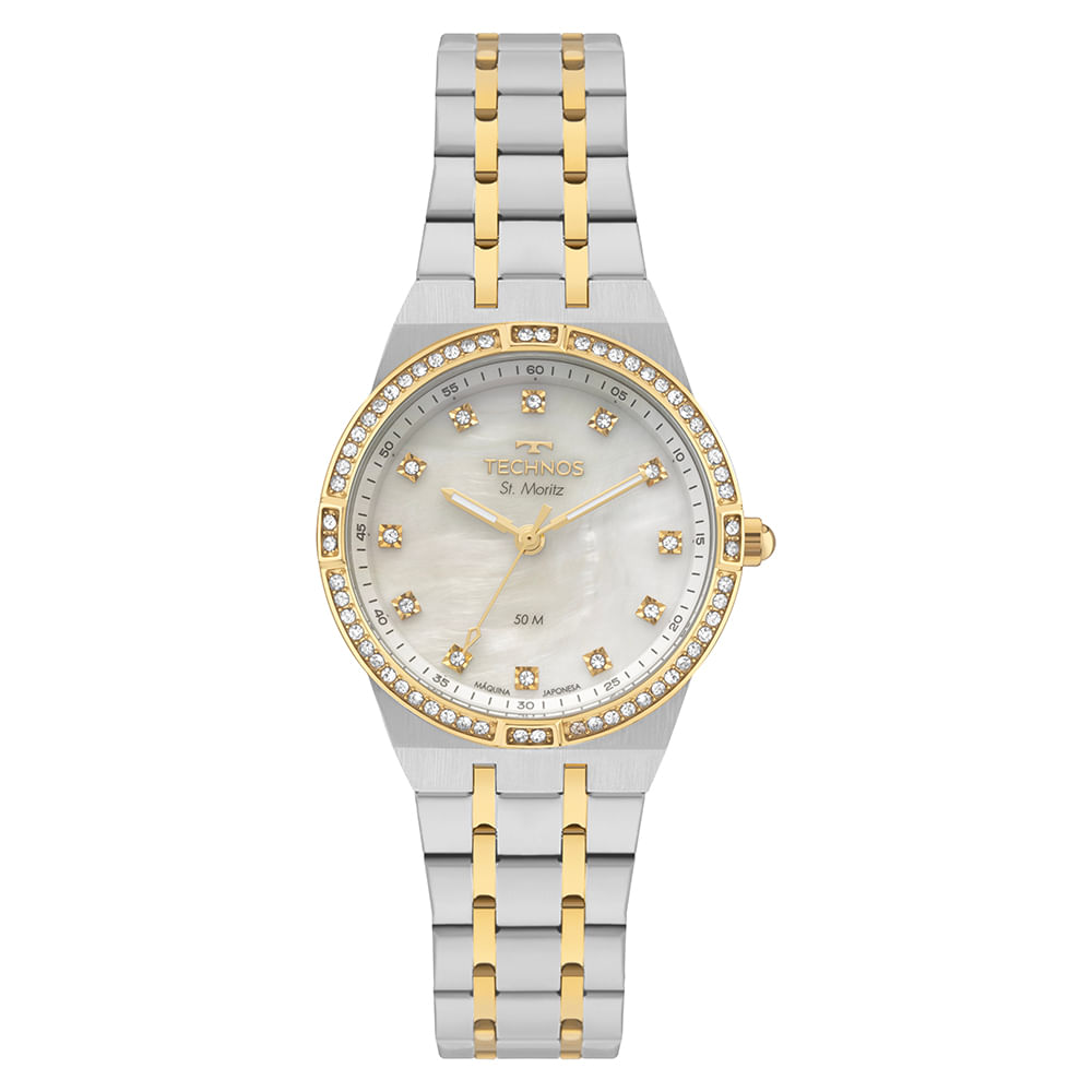 O St. Moritz traduz elegância clássica com acabamento sofisticado. Sua caixa de 34 mm em aço inoxidável se une à pulseira em aço com 5 links, garantindo conforto, presença e um visual atemporal. O mostrador branco em madrepérola oferece brilho delicado, valorizado pela aplicação de pedra no mostrador e ar, que adiciona um toque de joalheria ao design. Além disso, possui banho bicolor prata/dourado e resistência à água de até 50 metros.