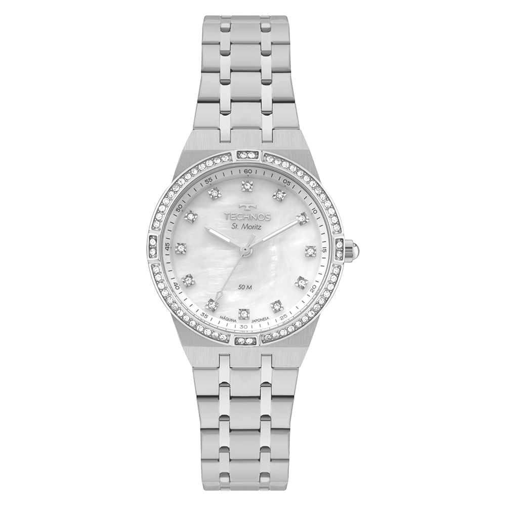 O St. Moritz traduz elegância clássica com acabamento sofisticado. Sua caixa de 34 mm em aço inoxidável se une à pulseira em aço com 5 links, garantindo conforto, presença e um visual atemporal. O mostrador branco em madrepérola oferece brilho delicado, valorizado pela aplicação de pedra no mostrador e ar, que adiciona um toque de joalheria ao design. Além disso, possui banho prata e resistência à água de até 50 metros.
