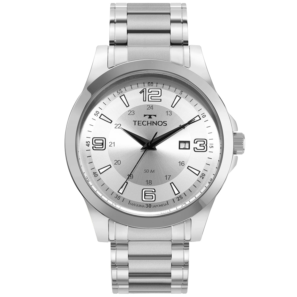 A linha Technos Racer combina design esportivo e alta legibilidade, com números arábicos grandes nas posições de 3, 6, 9 e 12 horas e dupla leitura no mostrador: