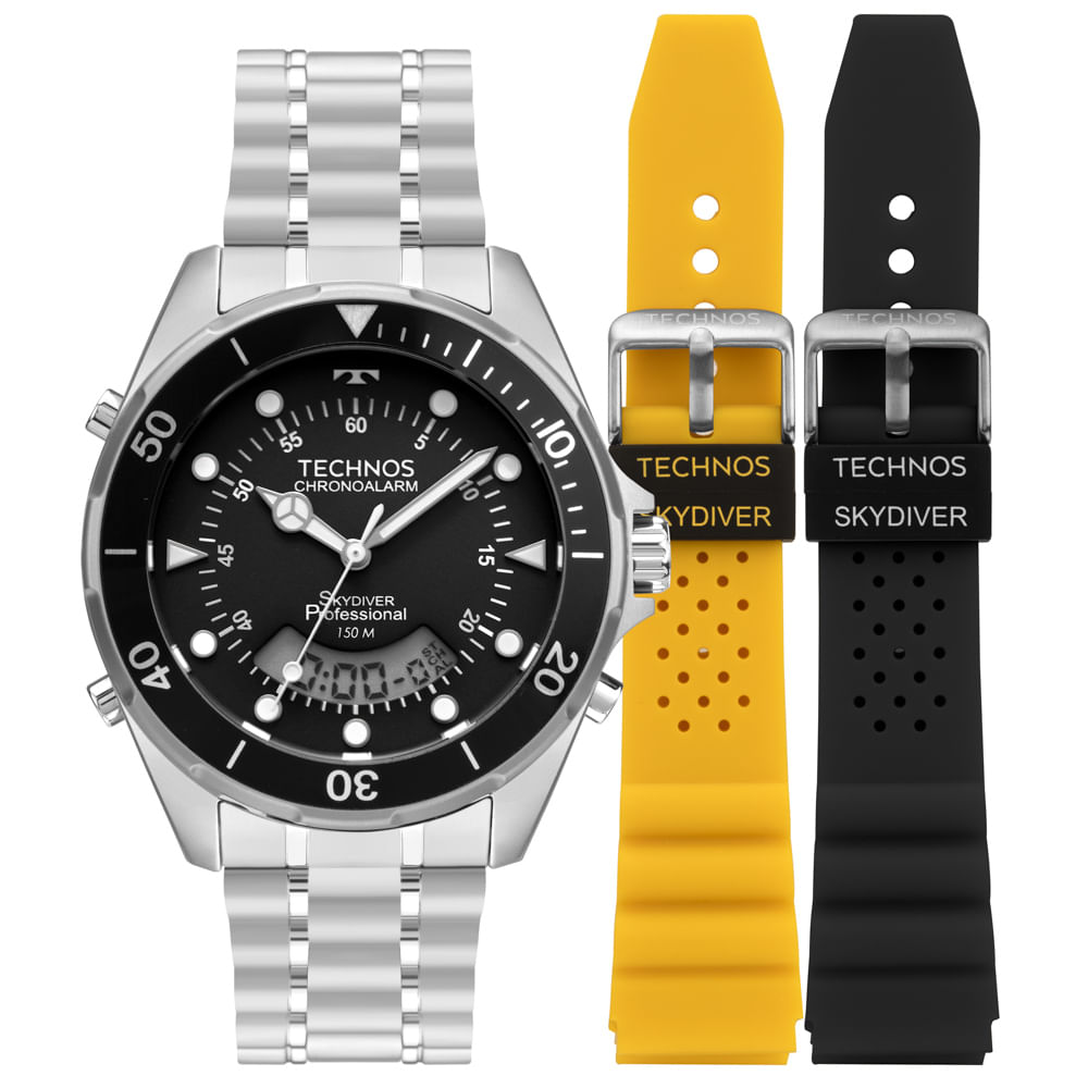 Com visual esportivo e robusto, este modelo da linha Skydiver traduz o espírito aventureiro da coleção. A caixa em aço inoxidável de 44 mm conta com aro giratório unidirecional com aplicação de alumínio reforçando sua identidade inspirada no universo dos mergulhadores. O mostrador preto destaca os marcadores luminescentes e o sistema anadigi com módulo exclusivo, uma assinatura da linha que combina leitura analógica e digital. Com resistência à água de até 150 metros, o modelo foi desenvolvido para oferecer desempenho e confiabilidade. A pulseira em aço inoxidável de 3 links acompanha duas pulseiras extras de silicone com assinatura da linha, nas combinações amarela e preta, permitindo trocar o visual do relógio com praticidade. Disponível no banho prata.